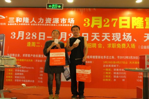 热烈祝贺三和隆开业庆典取得圆满成功,持续近二十天的抽奖正在火热进行中,不少企业和求职客户在实现心中所愿的同时,与幸运相依相伴,非常可喜的抽到了由三和隆倾情回馈的IPHONE 4S手机及各类现金奖项,同喜同贺。