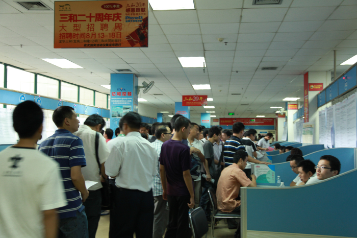 (8月14日三和龙华会馆招聘现场人流涌动,形成招聘热潮)