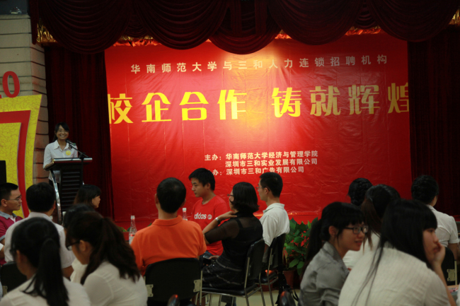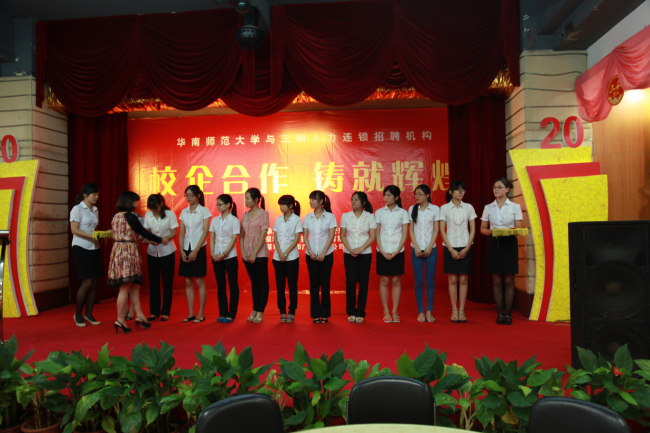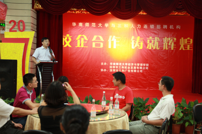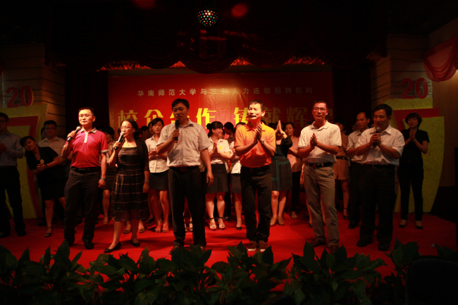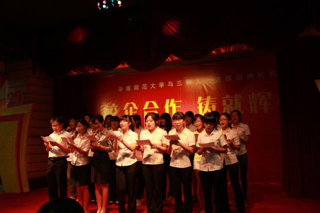 欢送晚会上,实习生代表做总结陈诉,在总结中,我们的实习生对三和给予他们这样宝贵的实习机会表示感谢,同时也表示自己在这次实习活动中学到了很多在学校里学不到的知识,最后衷心的祝愿三和的明天更加美好。华南师范大学彭壁玉院长也上台致辞,表达了学院对三和美好祝愿以及对校企合作模式的极大赞赏。最后,三和人力总经理许琴女士致欢送词,她对实习生的工作予以了充分肯定,感谢实习生为我公司带来的青春活力以及昂扬向上的干劲与热情,并祝愿他们今后的生活事业一帆风顺。