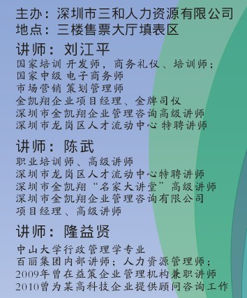 10月23日上午,龙华三和三楼售票大厅休息区,贵宾满座,气氛热烈。在这里,三和特邀老师刘江平老师正在为大家讲课。刘江平老师是三和公益求职讲座的特邀讲师,他以其精湛的授课技术、平易近人、风趣幽默的授课风格为大家带来了一场精彩纷呈的讲座——“营销自己,赢得人生”