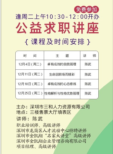 10月份开始龙华三和就联合深圳市金凯翔企业咨询管理有限公司每周定期举办公益求职讲座。12月我们热情依旧,为广大求职朋友送上温暖的“心灵鸡汤”,将公益进行到底;