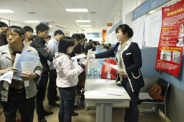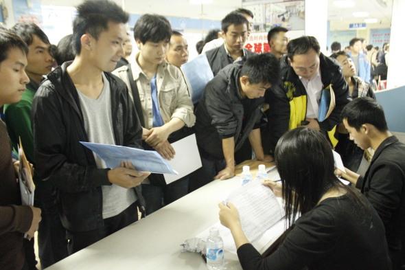 一家招聘企业前有数十名求职朋友等候,这种场面在招聘现场随处可见