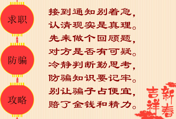 一年之际在于春,春节过后是求职招聘的高峰时期,各类人才求职旺期,同时也是各种以招工聘职为名实施诈骗的违法犯罪活动的多发期。求职心切的广大求职者应警惕“招聘陷阱”。为了给广大求职人员一个良好的环境,三和人力特别推出“求职防骗”攻略奉献给大家,希望您能在新的一年有个好的开始!