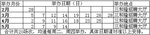备注:以上招聘日期及场次由龙岗区人力资源局局统一制订,如有更改请以三和隆现场招聘预告为准。