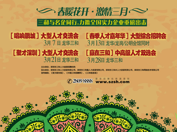 为促进充分就业,全面满足广大用人单位和求职者的共同需求,三和人才市场决定3月份推出4场大型主题招聘会,助力就业,努力为应聘双方搭建一个良好的沟通平台。