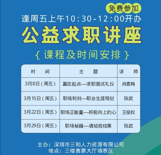 三和一直以来都把人力资源服务作为“爱心事业”来经营,在现场提供求职休息区、免费饮用水、免费信息查询区,让来三和找工作的求职朋友感受到一种受尊重有尊严、受爱护的人文关怀。为更好的服务求职朋友,帮助求职朋友更好的解决求职路上遇到的难题,龙华三和将为求职朋友们举办“求职公益讲座”,所有来到三和现场的朋友,都可以免费参加讲座。