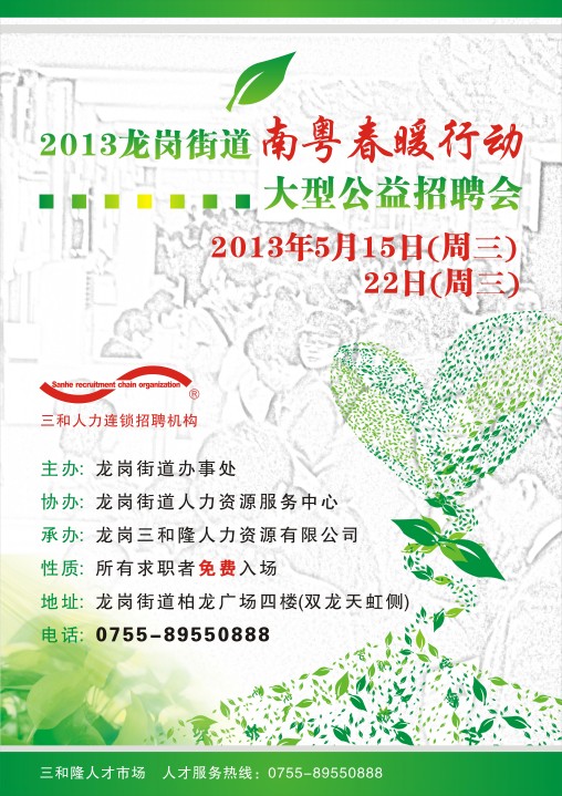 2013年5月15日、22日分别在三和隆人才市场联合举办两场“南粤春暖”大型专场招聘会;