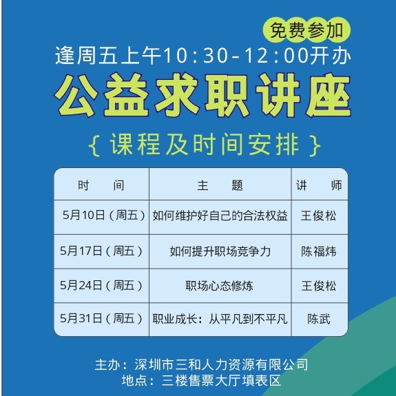 今天,三和求职公益讲座5月份第二场在龙华三和三楼售票大厅休息区举行,三和人事主任陈主任,与100余位求职朋友交流如何《提升职场竞争力》。
