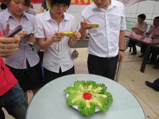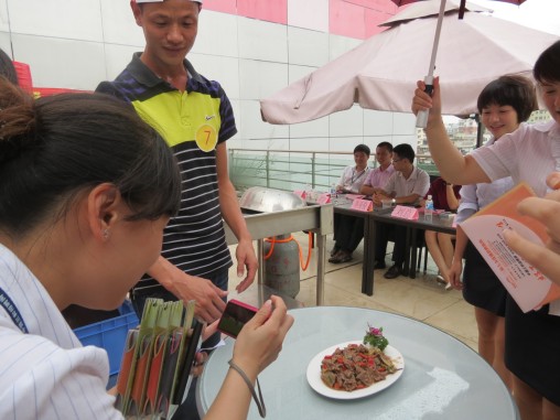 据说,“牛气冲天”味道还不错,可能是第一个出场搞得自己有些紧张了,牛肉稍微老了些,火候未完全掌握好;椒盐虾呢,无论是评审团还是观众评委都大加赞赏,认为味道实在是太鲜香了,希望在装盘的时候要多花点心思;后面还有两道“鱼”和一道农家小炒肉,以及那份“上刀山下油锅”的红烧排骨,味道都挺不错的,尝得大众评委都跟“抢购”似的疯狂,一上桌就被一“夹”而空,太热闹了。但,其实好戏都在后头,“好花慢慢开”,还真没想到,真的契合了上面讲的,这美味就真的是“剁”出来的,恰恰是最后一道“花开富贵”拔得头筹,成为今天的“厨神大奖”,可谓实至名归呀。