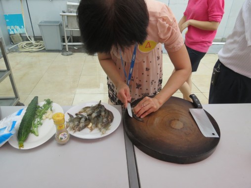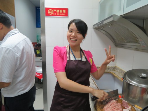 秀的是什么?秀的是刀功。砧砧剁剁的架势,看起来就让人害怕,锋利的菜刀在双手间来回切剁,剁完再剁,还翻来覆去的反复剁碎,场景不免让人想起当年《食神》里面“濑尿牛丸”的疯狂做法,莫非,这就是所谓的诀窍,疯狂的如出一辙?餐中美味都是这么“剁”出来的?从这位美女的造型来看,似乎是自信满满呀。