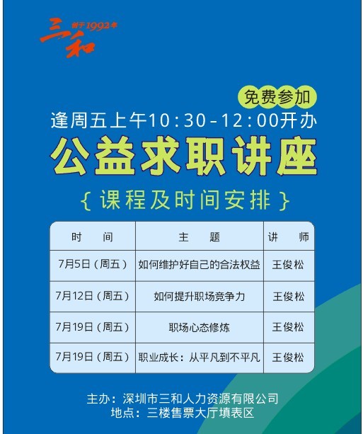三和“把人力资源当作爱心事业来经营”,公益求职讲座自举办以来得到了广大求职朋友的肯定与喜爱,每一期的讲座都给来听讲座的朋友在工作和生活中增添了正能量。七月,龙华三和安排了四场免费的公益讲座,好讲座,让你在职场更轻松!