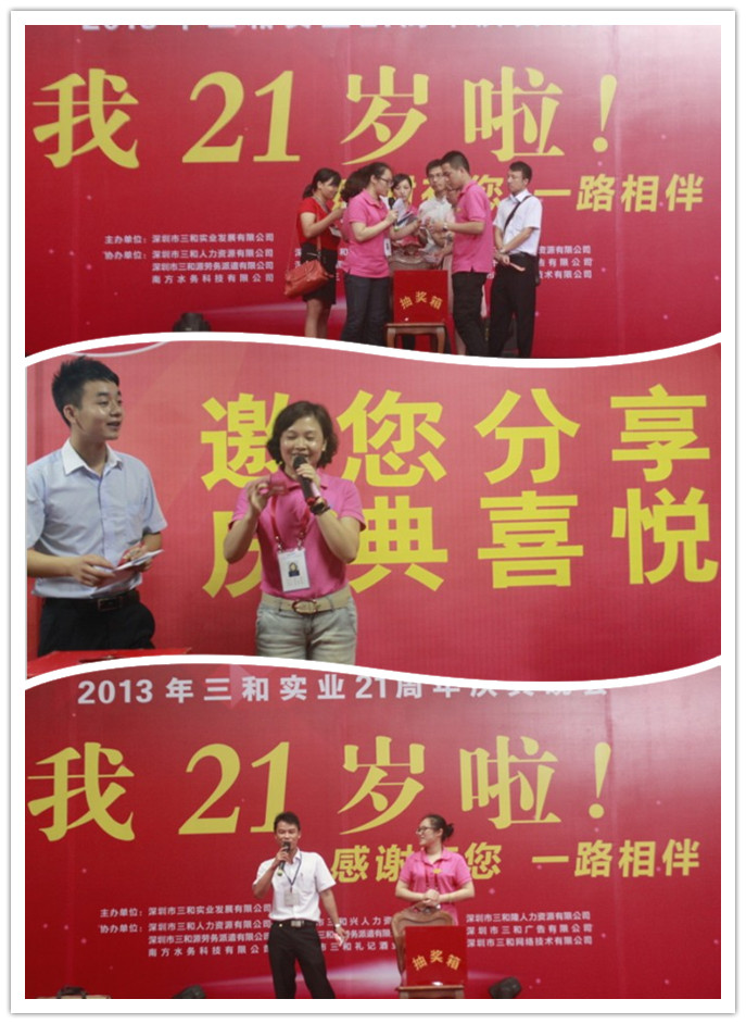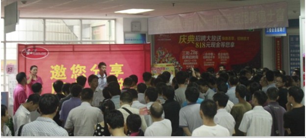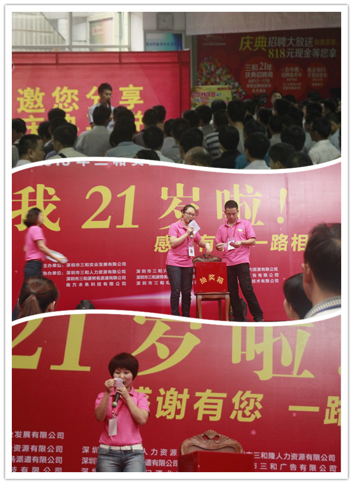 2013年8月18日上午11点,三和21周年庆感恩系列活动之‘<会中惠>招聘嘉年华’求职招聘抽奖送礼活动在三和人力连锁机构龙华总部准时举行。