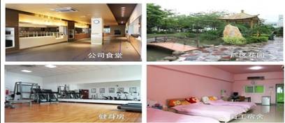 公司配套设施:健身房,乒乓不球室、医务室、理发室、图书室、空调宿舍、超市、篮球场、卡拉OK房、网吧、厂区花园及足球场等。