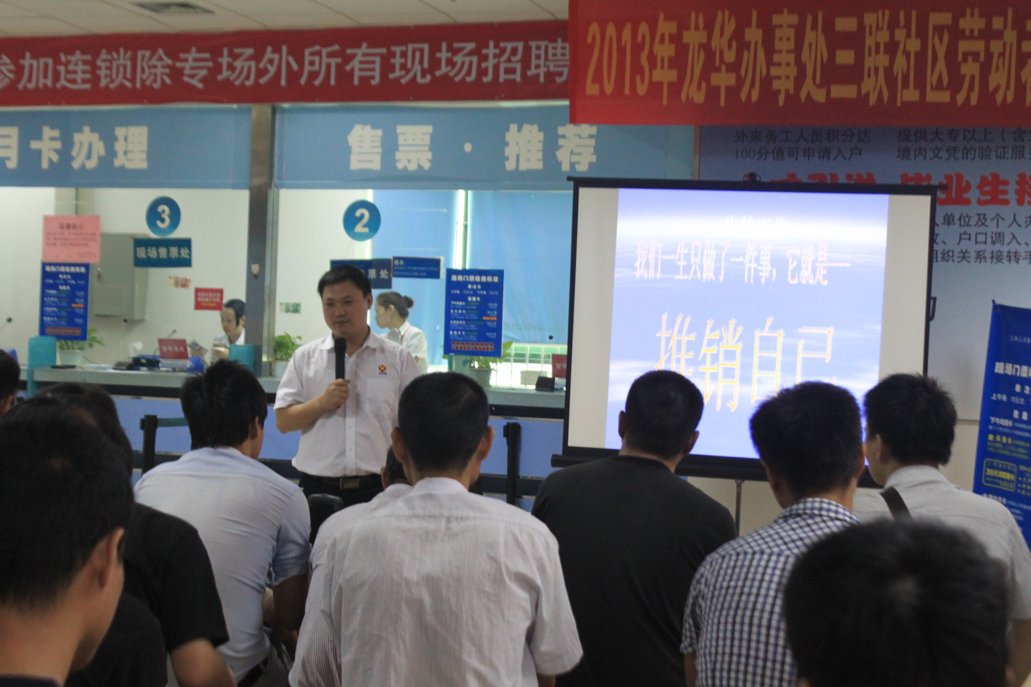 2013年9月6日上午十点,由三和人力资源有限公司主办,深圳市金凯翔企业管理咨询有限公司著名讲师-王俊松老师主讲的“求职公益讲座—推销自己”在三楼售票大厅休息区举行并获得了圆满成功。