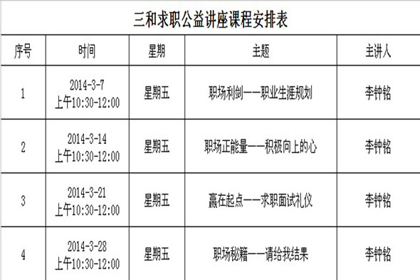 为了进一步帮助各位求职朋友们,三月份,龙华三和人力特举办四场公益求职讲座,旨在帮助求职朋友们提高求职应聘技巧、明确自己的技能兴趣爱好、以及如何正确面对职场心理等等。