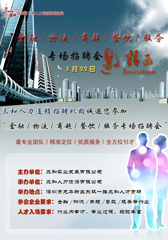 三和人力连锁招聘机构将于5月22号(周四)以最专业的运营团队,最优质的服务态度重点打造“金融/物流/商超/餐饮/服务行业专场招聘会”精准招聘定位,全方位的宣传引才,让您感受焕然一新的招聘氛围!
