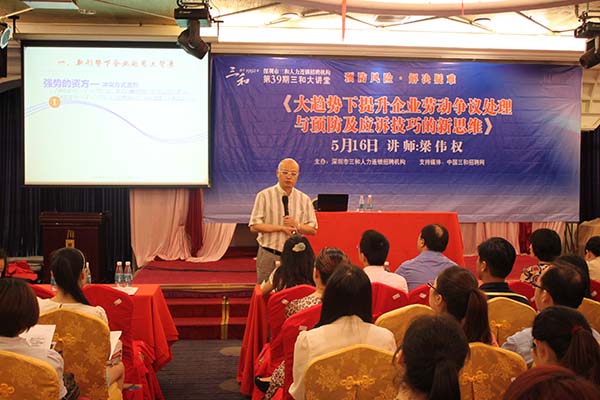 5月16日下午,由深圳市三和人力资源有限公司主办的第39期三和大讲堂,在龙华龙泉酒店举办,并取得圆满成功。此次主讲嘉宾是中国著名劳资问题解决专家、中国劳资关系研究院院长梁伟权,他与在场的300多位企业HR同聚一堂,详细解读了《大趋势下提升企业劳动争议处理与预防及应诉技巧的新思维》,为求帮助企业预防风险,解决疑难。