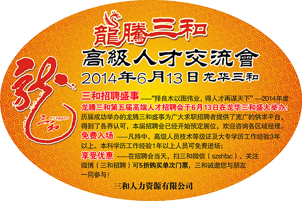 夏日炎炎,六月如火。6月13日,深圳人力资源机构第一品牌——龙华三和,将举办一场人才市场的求职盛宴——“龙腾三和”高级人才交流会。我们已经做好准备,全力以赴为您服务。