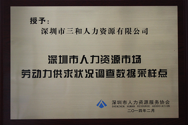 2014年2月,深圳市三和人力连锁招聘机构又获一殊荣,被授予深圳市人力资源市场劳动力供求状况调查数据采样点,此举进一步垫定深圳市三和人力连锁招聘机构,在深圳行业内最具影响力职介机构品牌的地位。三和人力连锁招聘机构被授予劳动力供求状况调查数据采样点。