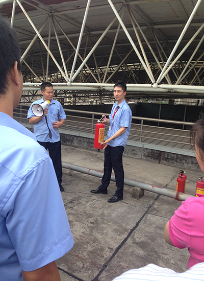 最后教员还组织全体员工进行了一次消防演习。在演习的过程中,随着一阵刺耳的警铃声响起,全体员工在安管部的指导下,捂住口鼻,迅速按照正确的逃生方法和路线,安全有序地疏散到四楼顶层的安全地带,不到3分钟,全体员工就安全疏散完毕。