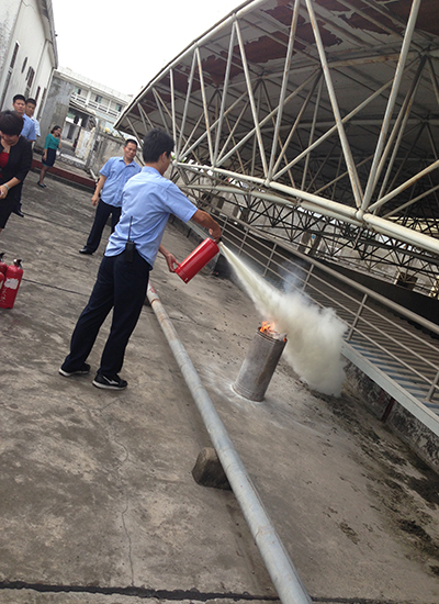 在四楼顶层的安全地带,安管部钟经理还安排人员给在场的所有员工演示如何用灭火器正确处理火源。并让在场的部分员工充分利用这个难得的机会试用灭火器。在演习完了之后,三和人力总经理许琴女士发表讲话。