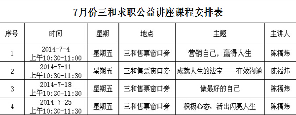 努力工作是实现人生价值的途径之一,但是如何努力工作才能取得职场成功呢?龙华三和人力资源部陈主任,将在7月份的4场公益讲座中继续跟大家交流、学习。