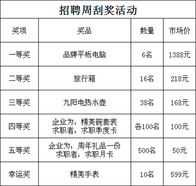 凡在招聘周(8.11-8.18)期间内,企业消费后即可获取周年纪念品一份,以及刮刮奖一张;企业会员也可领取刮刮奖一张。