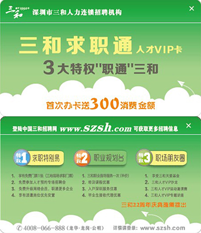 求职朋友:三和成立22周年之际,三和推出三和求职VIP卡,持有此卡您享有卡中附带的所有优惠,例如享有免费门票一张、免费参加人才预约专场招聘会等等。卡内还有300元现金抵用券。