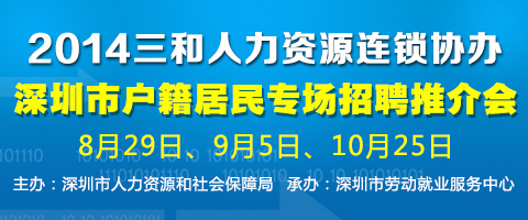 为拓宽户籍失业人员就业渠道,帮助就业困难人员再就业,促进社会和谐稳定,深圳市三和人力资源有限公司与深圳市劳动就业服务中心联手,本着共同做好公益服务的目的,以充分促进户籍人员就业工作为原则,于2014年举办三场户籍人员专场招聘推介会,共同为推动社会就业做出努力。