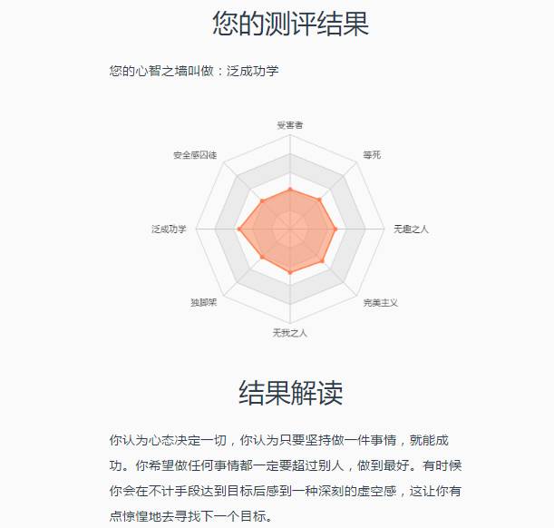 心智之墙定位器,是生涯规划师古典老师畅销书《拆掉思维里的墙》中使用的一套专业化测评,由新精英生涯研发,整合了古典老师书中提到的八大心智模式,分别是:“安全感囚徒”模式,“无趣之人”模式,“泛成功学”模式,“完美主义”模式,“受害者”模式,“无我之人”模式,“等死”模式,“独角架”模式。