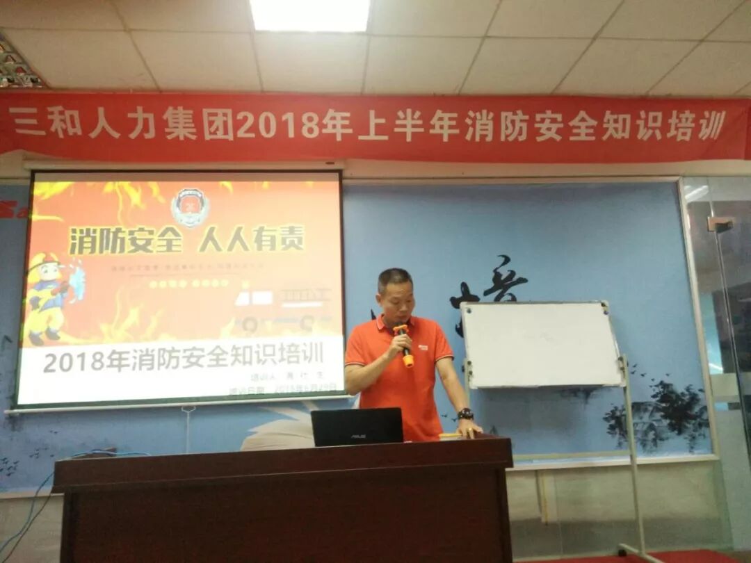 次消防培训和消防演习将理论与实践有效结合,提高了员工的消防意识和防灾减患技能,普及了消防知识,取得了较好效果。本次培训各部门人员均参加,由三和人力集团消防培训老师黄社生主持,三和集团总经理许女士,三和集团执行董事戴总,安全负责人钟帝新出席了消防知识培训及演练。2018年上半年消防知识培训会圆满成功!