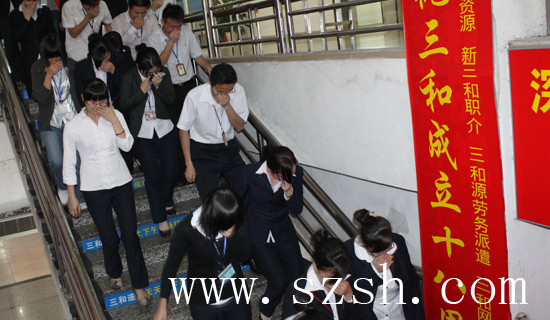 深圳市三和人力资源有限公司2010年10月26日进行了全体员工的消防知识培训,同时定于2010年10月27日(今天)进行消防大演习,以提升全公司人员的消防意识,做好消防安全工作。