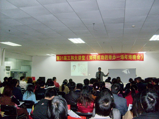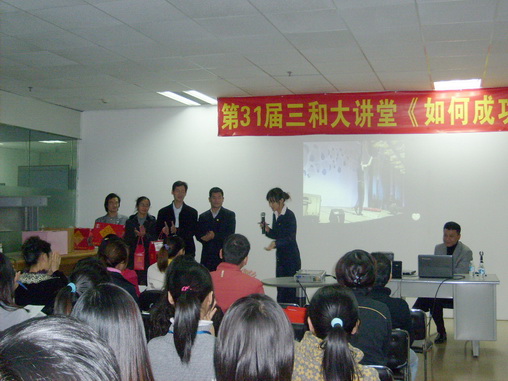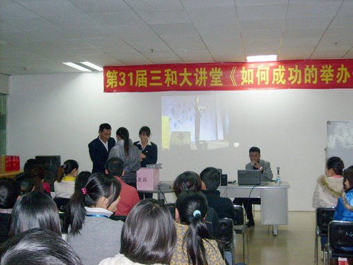 12月18日,继三和连锁年度大型主题招聘—“年底职场总动员”17日在三和隆成功举办后,第31届《三和大讲堂之如何成功策划企业晚会》首场也在三和隆顺利闭幕。本次《三和大讲堂》和以往不同的是,除了三和隆和三和连锁招聘机构两家主办单位外,还首度联合了龙岗大运会特许商品事业部、纬五度营销策划公司、好人缘文化传播有限公司等三家协办单位,不仅让讲座变得更加令人期待,同时也增设了大运纪念奖品抽奖环节,为本次活动的成功举办增色不少。
