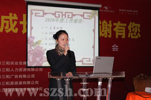 12月30日,深圳市三和人力资源有限公司2010年年终总结大会在龙华多功能厅顺利召开。公司高管及全体员工共同出席了会议。本次会议全面汇报了公司2010年的运行情况,既总结了一年来取得的成绩,也对2010年工作的失误和不足进行了分析。同时,在此基础上部署了2011年工作规划。会议由董事长助理戴良琴主持。