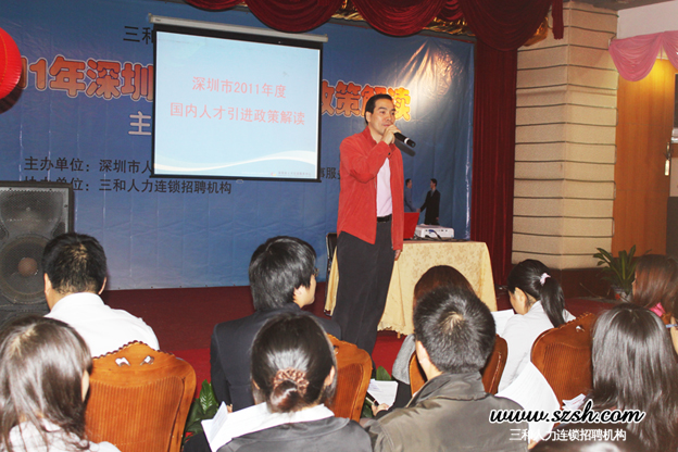 3月31日上午9:30,由市人才交流服务中心和龙华三和人事服务窗口主办,三和人力连锁招聘机构承办的2011年深圳市人才引进政策解读交流会在龙华会馆多功能厅正式举行。市人才交流服务中心华南城分部钟祥诚部长和与会的200多名企业界代表共同分享了《2011年的深圳市人才引进政策》,对政策进行了仔细梳理,并对企业关心的重点问题进行了解析。