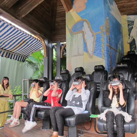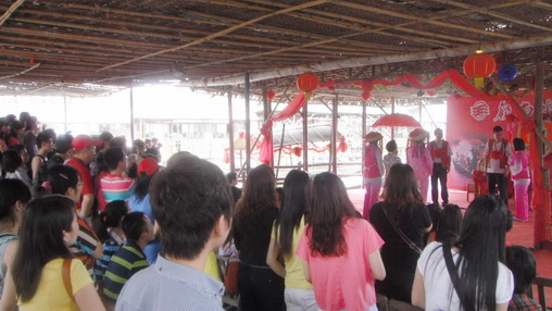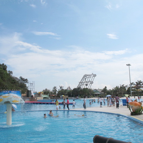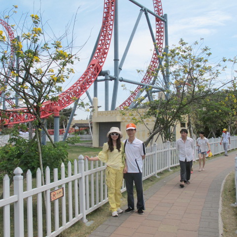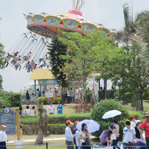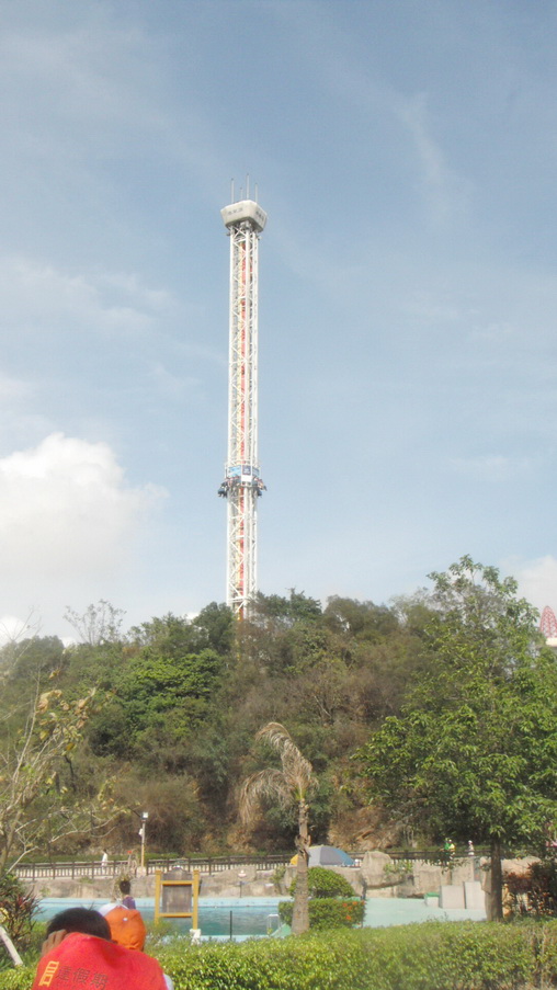 这个就是号称亚洲第一座的“垂直极限”,项目位于珠海海泉湾之神秘岛内,也是这次旅游的终点站。很多同事为了体验这把刺激,可是足足排了近一个小时的队伍,才把这瘾给过上的。不过,这刺激,不是一般人敢尝试的,它的推力可以瞬间把你发射上去又坠落下来,活生生的被失重和超重同时“袭击”,所以,很多胆小的同事看了都怕,只好选玩这个项目—飓风飞椅。坐上去后慢慢绕着转圈,再慢慢升高加速,虽然转得头有点晕,但还是充满乐趣。