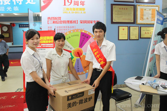 为了共享三和发展成果,分享三和喜悦,在三和十九周年庆典之际,三和为顾客朋友们推出多重好礼相送。龙华三和推出的刮刮奖,让求职者和企业代表在求职、招聘的同时更多了一份惊喜。同时做为会员制人力资源机构,三和也注重对会员企业的维护与回馈,在周年庆典期间,龙华三和给会员企业代表准备了一份精美礼品;同时针对八月份新入会或者续会的会员企业,独具匠心的推出摇奖活动,设置丰厚的大奖让企业得到更多超值体验!