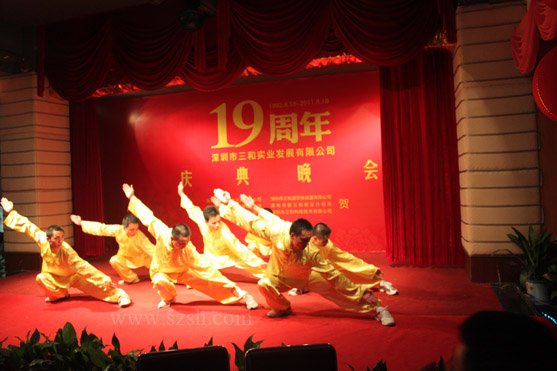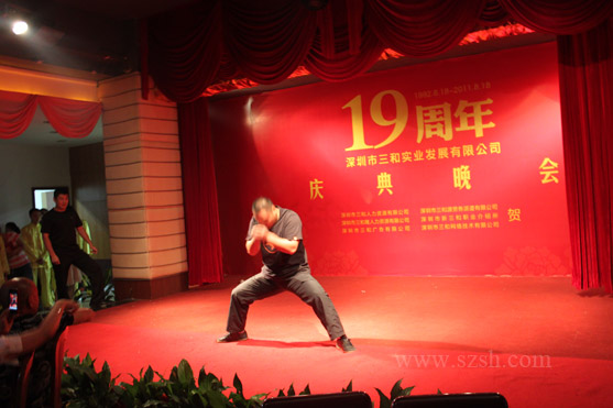 其中三和源的全体同事还用荧光棒舞出的一串串数字来诠释三和源劳务派遣有限公司所取得的成就和对未来的憧憬,独特的创意赢得了大家的普遍赞誉!而来自华南师范大学的一群实习生们更是将《超幸福鞋垫》改编成《超温馨月饼》,既契合了主题,又通过这种方式传达出对三和的一种感激。精致幽默的台词、独特到位的表演,恰到好处的改动,都表现出了他们的良苦用心。而由退伍军人组成的保卫部则以一套虎虎生威的《少林五步拳》点燃起了现场观众的热情,在《男儿当自强》的配乐声中,雷动的掌声和台上刚猛遒劲的拳法表演相得益彰,将晚会推向了一个高潮。如果说保卫部的少林拳是一种刚劲之美,那么由“三和舞王”之称的欧艳和搭档陈志强则把一种柔美演绎到了极致。默契的配合、富有感染力的表演,传神的把《胡杨情愫》中胡杨这种“沙漠英雄树”的顽强品质表达了出来……